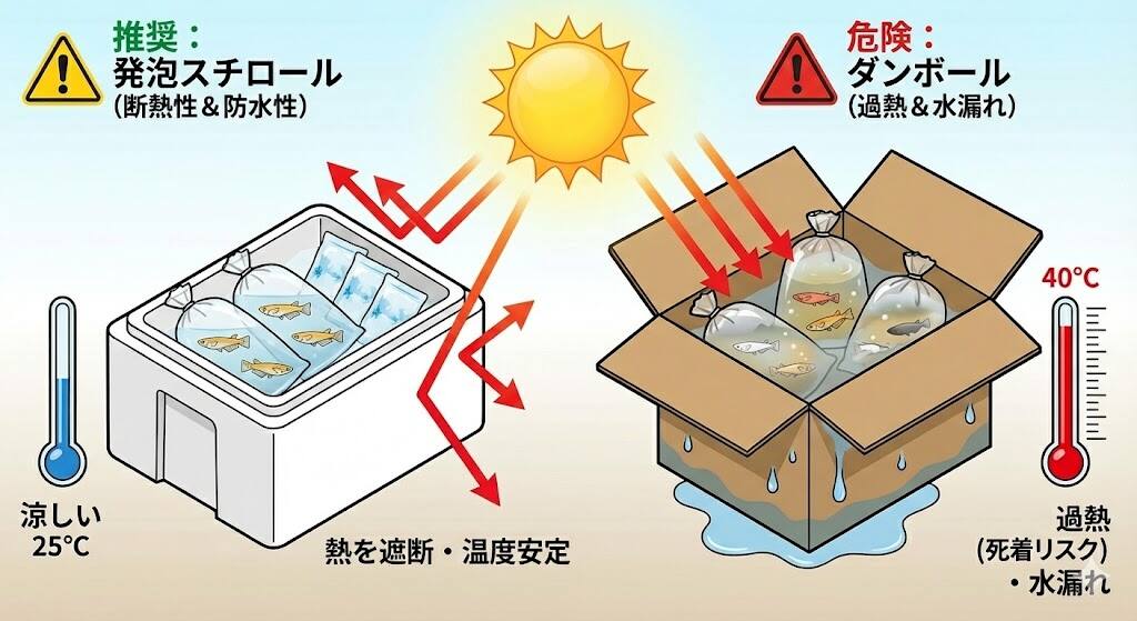 ダンボールと発泡スチロールでは、熱伝導率(断熱性能)が決定的に異なります。 外気が氷点下、あるいは35℃を超える猛暑の中、断熱性の低いダンボールで輸送することは、生体を外気に晒しているのと同義です。急激な温度変化は、変温動物である魚にとって致命傷となります。
