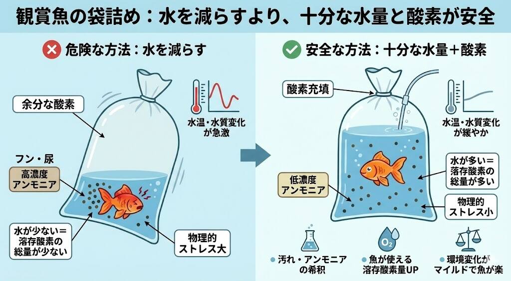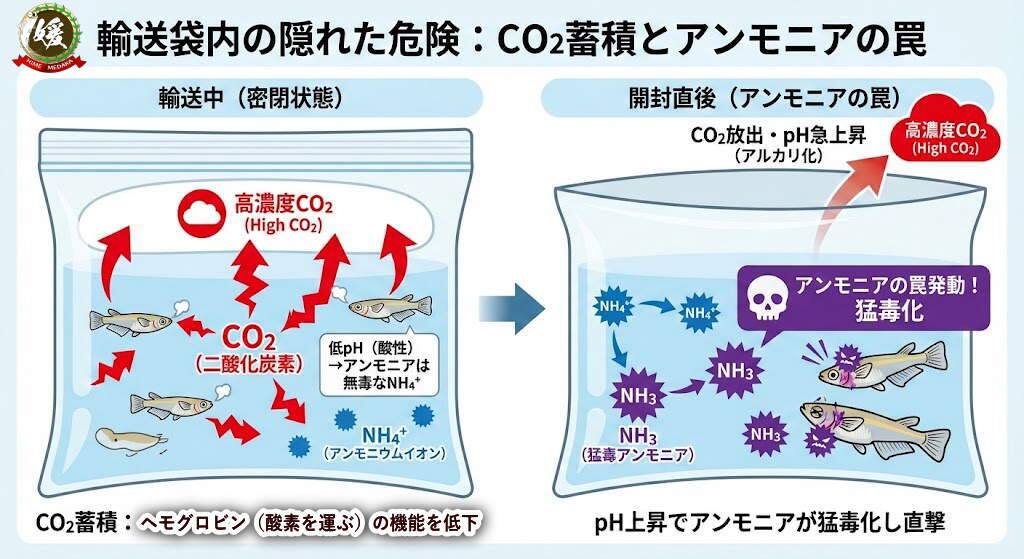 魚を袋詰めして送ると、密閉された空間で酸素は十分でも、二酸化炭素(CO₂)が蓄積して魚が弱ってしまいます。さらに、アンモニアという有毒物質も増えて、スレ傷や粘膜剥離につながります。