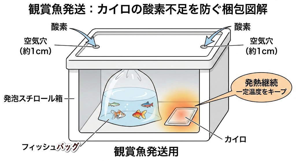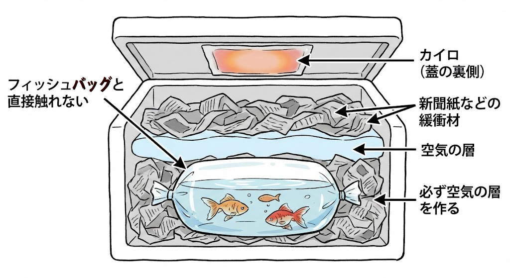 カイロの表面温度は最大60℃以上に達します。袋(フィッシュバッグ)への「直貼り」は、局所的な水温急上昇(煮え)を招き、致命的です。必ず新聞紙や緩衝材で空気層を作り、箱全体を温める、部屋を温めるようなイメージで配置します。