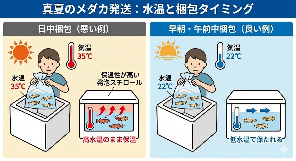 屋外飼育のメダカに限った話をすれば、夏場に発送する場合、「梱包する時間帯」も大切です。