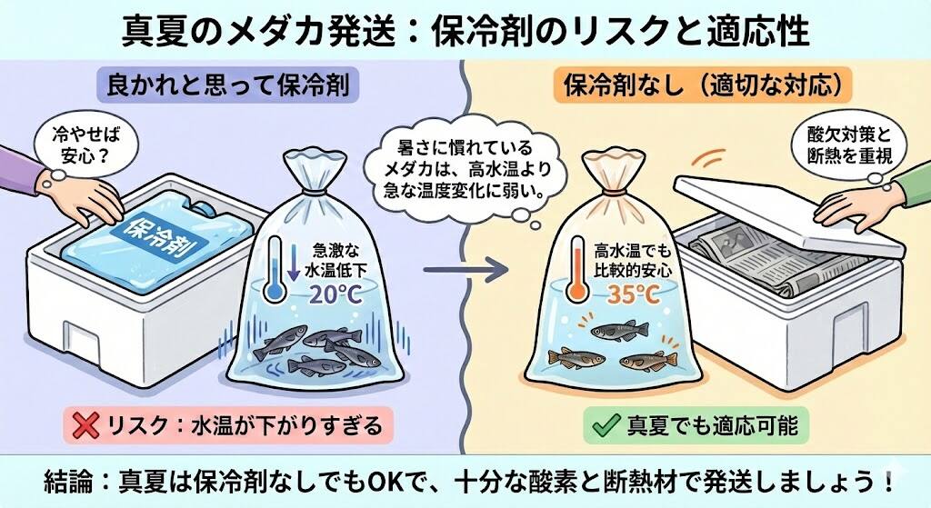 夏場のメダカの発送においては、保冷剤の使用は賛否が分かれますが、メダカに関しては不要なケースが多いです。