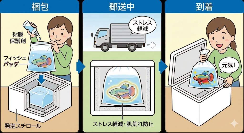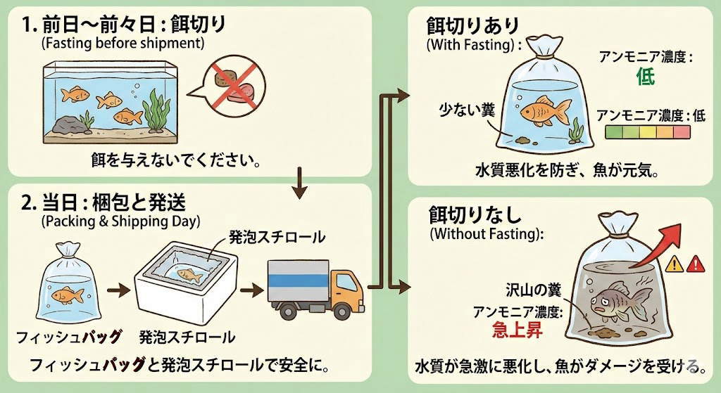 観賞魚の発送は「届いた瞬間に生きているか」だけでなく、「その後の飼育で病気にならないか」まで配慮する必要があります。以下の手順を遵守してください。