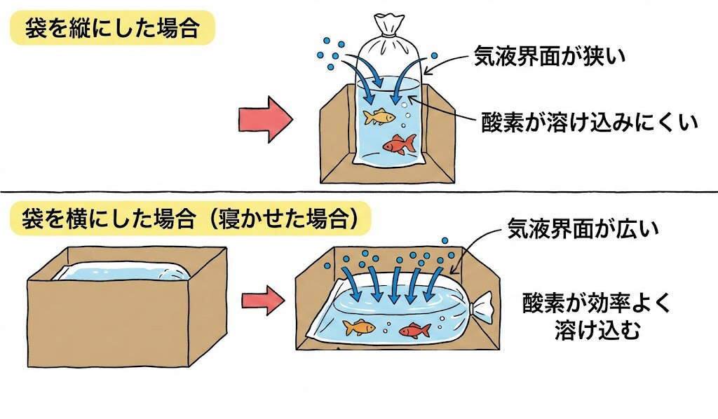 袋を立てて梱包するよりも、横に寝かせて梱包する(横梱包)方が、水面(気液界面)の面積が広くなります。