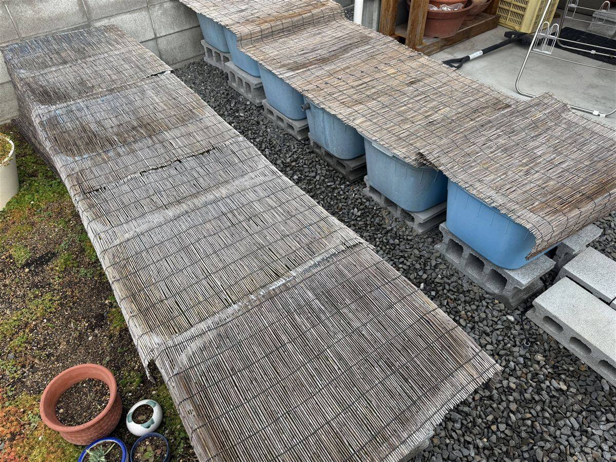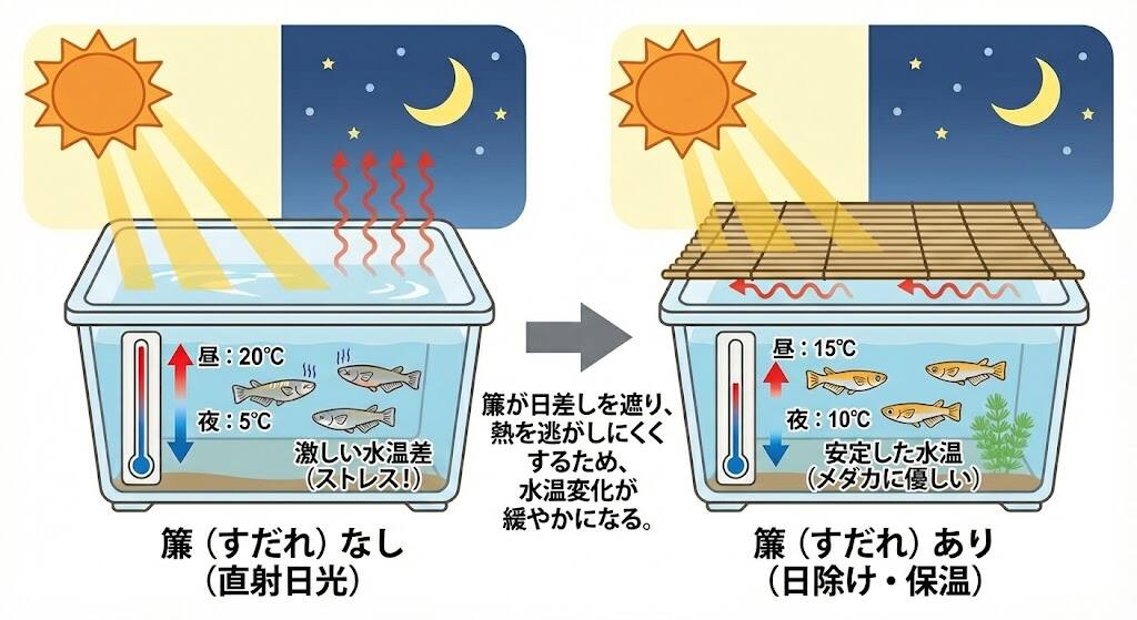 数日後に寒くなることが分かっている場合は、小春日和であっても、あえて飼育容器に「簾(すだれ)」などを掛け、日陰を作ります。