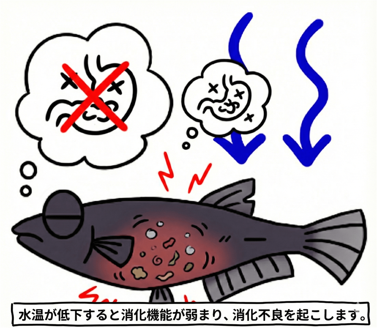お腹に餌が残った状態で寒波を迎えると、消化が止まり、餌が体内で腐敗してガスが発生したり、内臓疾患を引き起こしたりします。