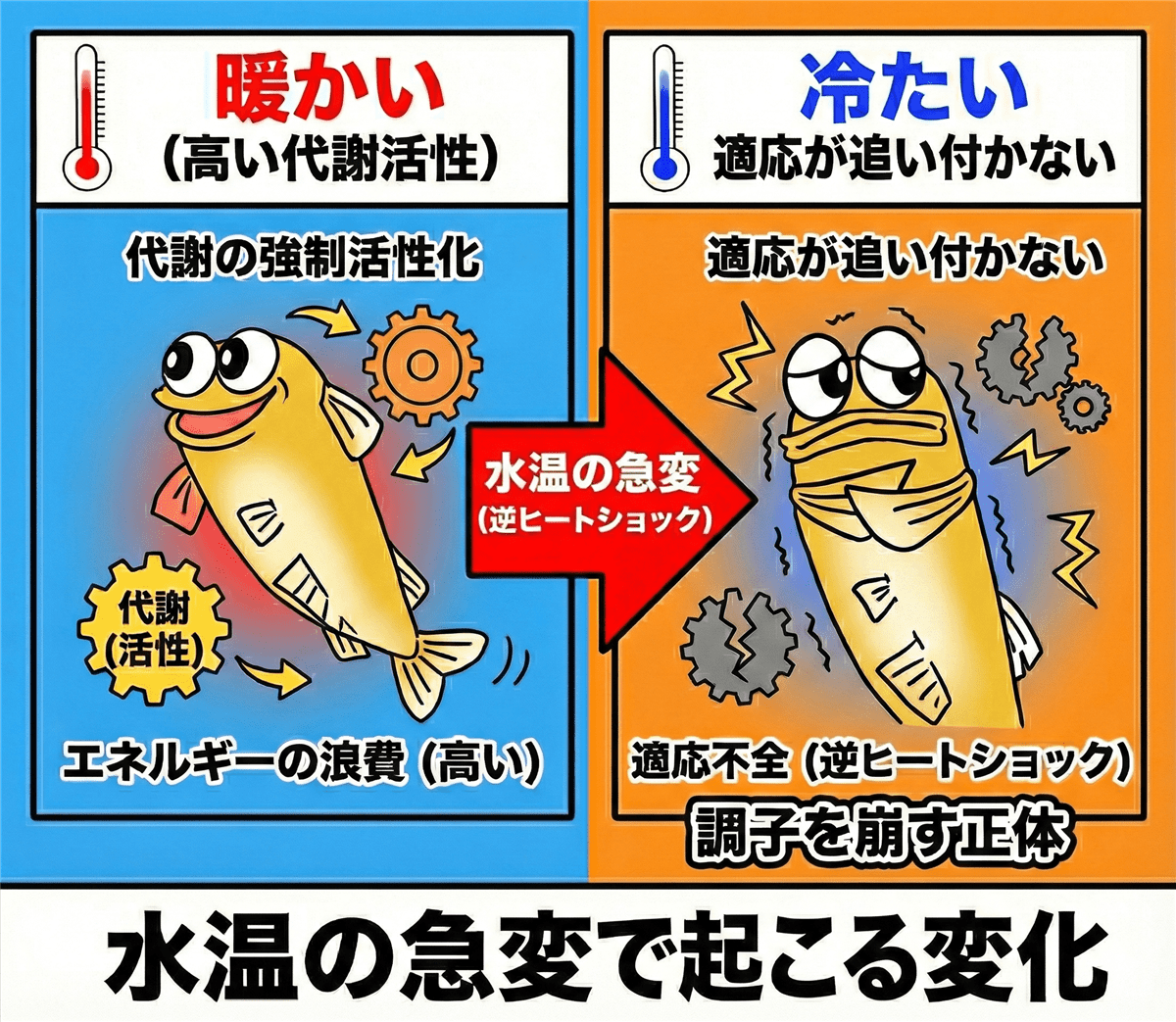 この「ジェットコースターのような急激な環境変化」こそが、変温動物であるメダカにとって最大のダメージ要因となります。