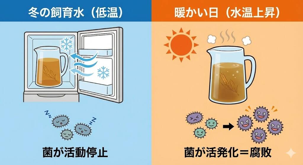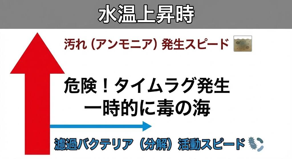 水温が上がると、糞や残り餌等を分解して「アンモニア(毒)」を出す菌(有機栄養細菌)はすぐに活発化します。