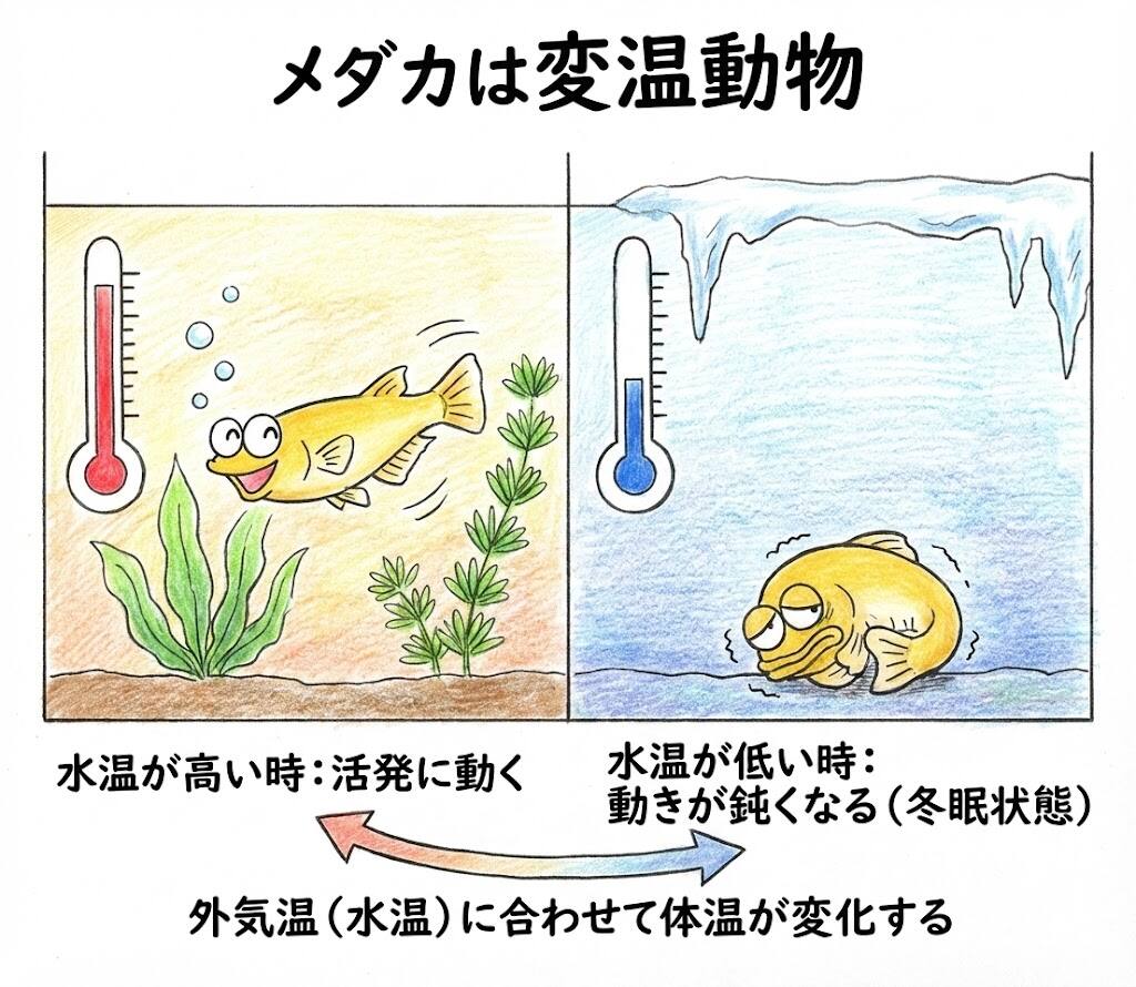 メダカは変温動物です。水温が下がると体温も下がり、食べた餌を消化吸収するための「消化酵素」の働きが極端に低下します。