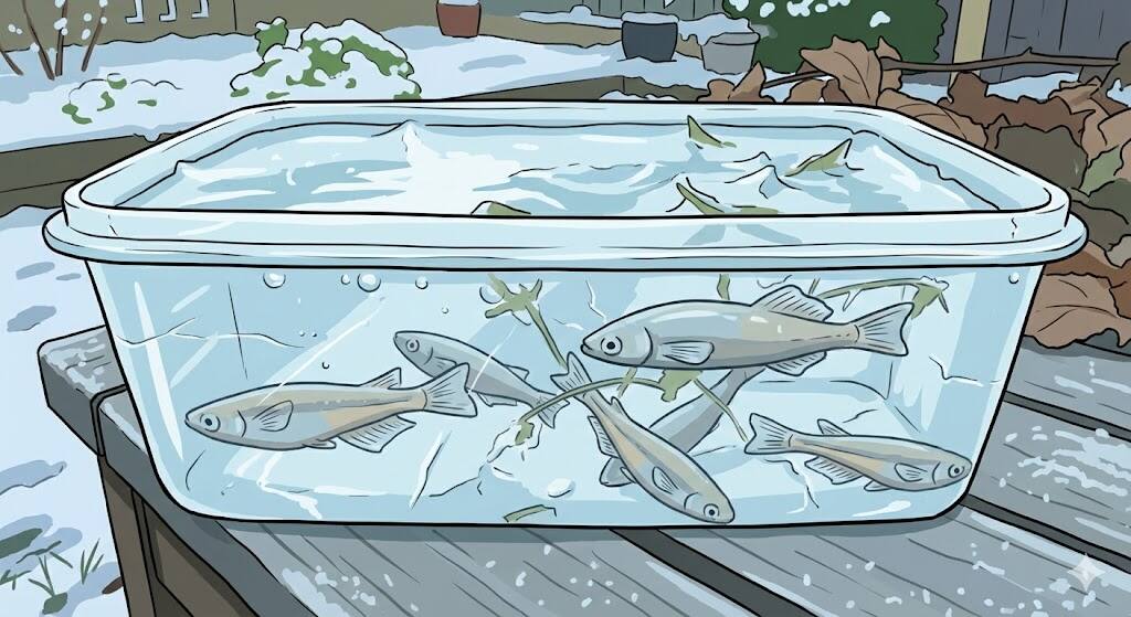 また、容器の種類や水深によっては寒波中においても「水がすべて凍り付きメダカ事凍ってしまう」といった可能性がある場合は氷を取り除き減った分の水を足し水した方が良いケースもあります。