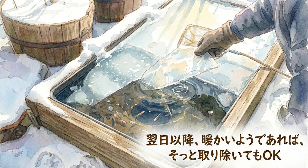 寒波が通り過ぎ、晴れ間と共に水面の氷が解け始めてきた場合は氷を取り除いてあげて問題ありません。