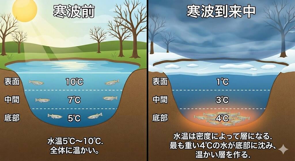 この時に下がった水温が底の方に溜まってきます。これは水温は約4℃が一番重いためです。