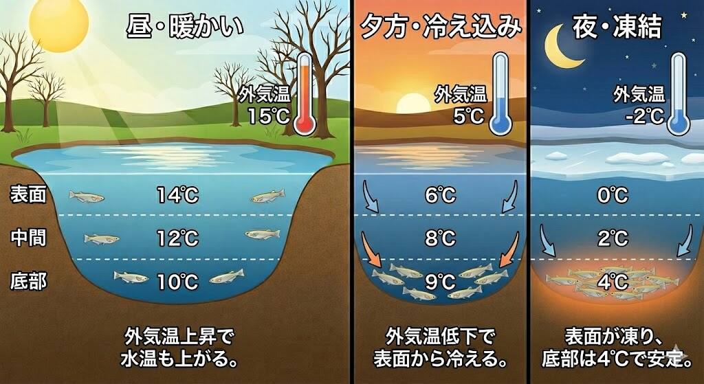 これが寒い日でも水面付近を泳ぐこともあれば、水底付近に集まることもある理由です。
