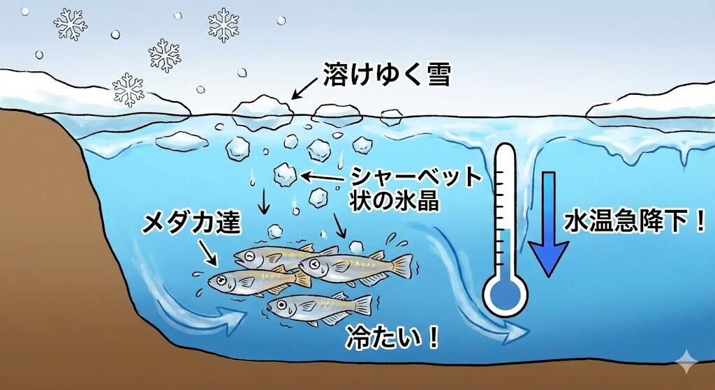 冷たい冷たいシャーベット状の雪がメダカ達に降り注いでいきます。