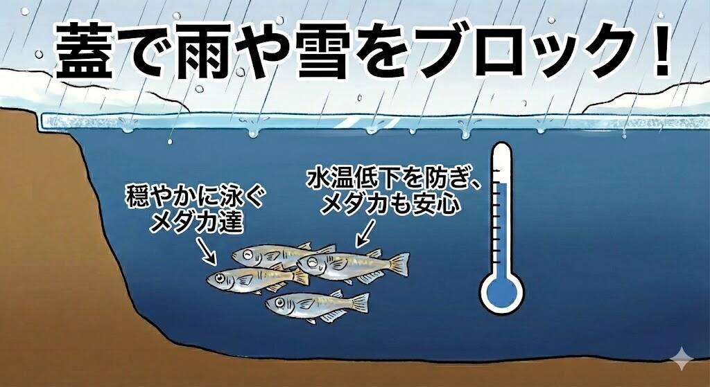 雪や雨が当たらない軒下飼育であっても蓋をすることで水温面は変わってきます。