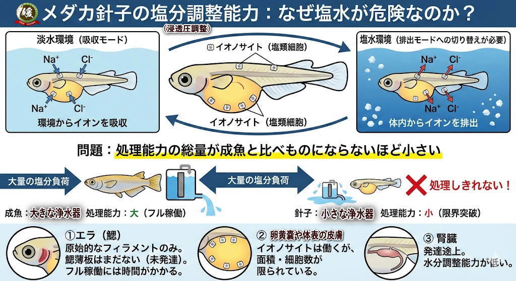 針子のイオン調節の「処理能力の総量」は極めて小さく、成魚にとっては微調整で済む環境変化でも、針子にとっては違います。