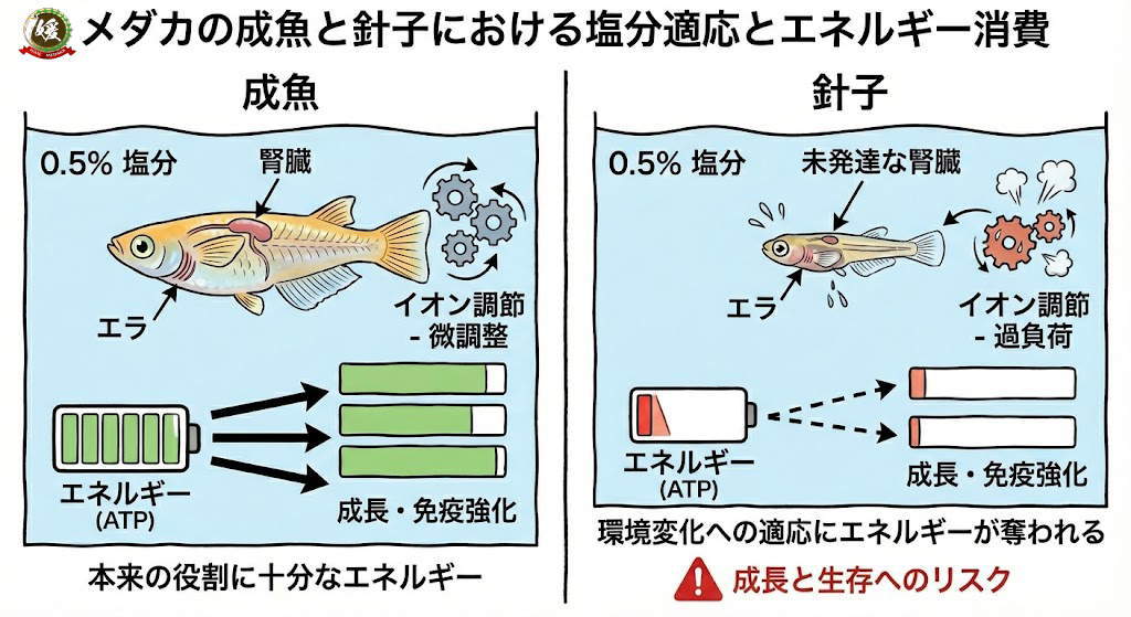 問題なのは、急な塩分変化が細胞レベルのストレス応答を引き起こし、その対応にエネルギーを奪われることがあるところです。本来なら成長や免疫の強化に使うべきエネルギーが、環境変化への適応に消費されてしまう。