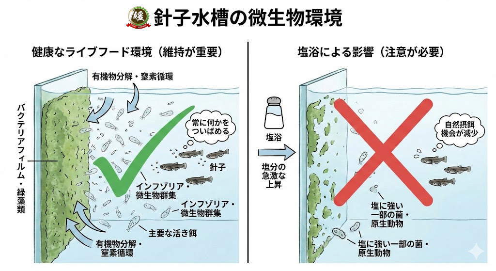 その結果、塩に強い一部の菌や原生動物が優占し、壁面バイオフィルムやインフゾリア密度が下がることで、針子の自然摂餌機会が減ってしまうおそれがあります。
