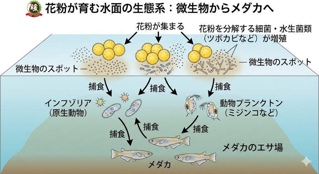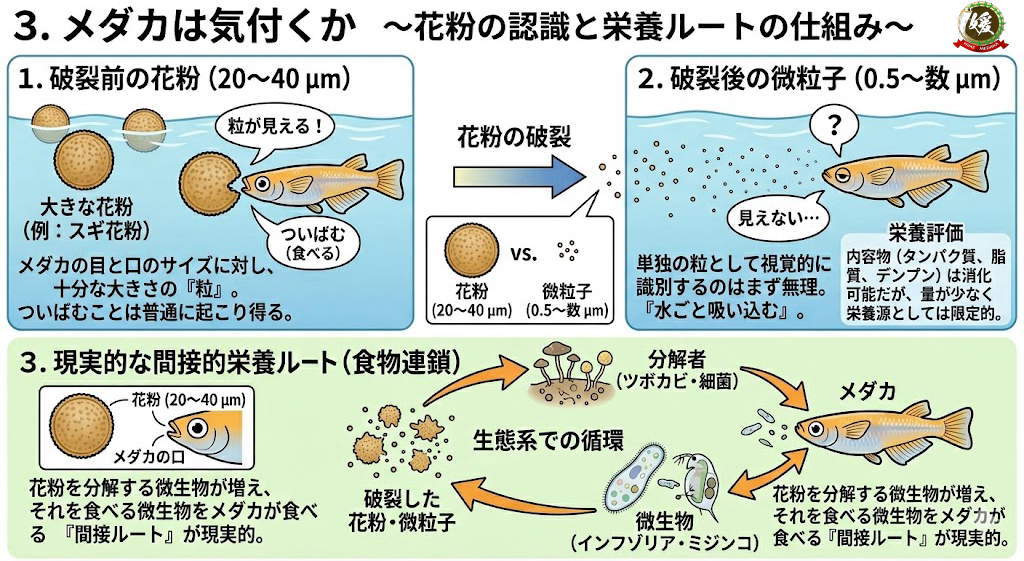むしろ現実的には、花粉を分解するツボカビや細菌が増え、それをインフゾリアやミジンコが食べ、さらにメダカがそれらを食べるという「間接ルート」で栄養が回っている可能性の方が高いと考えられます。