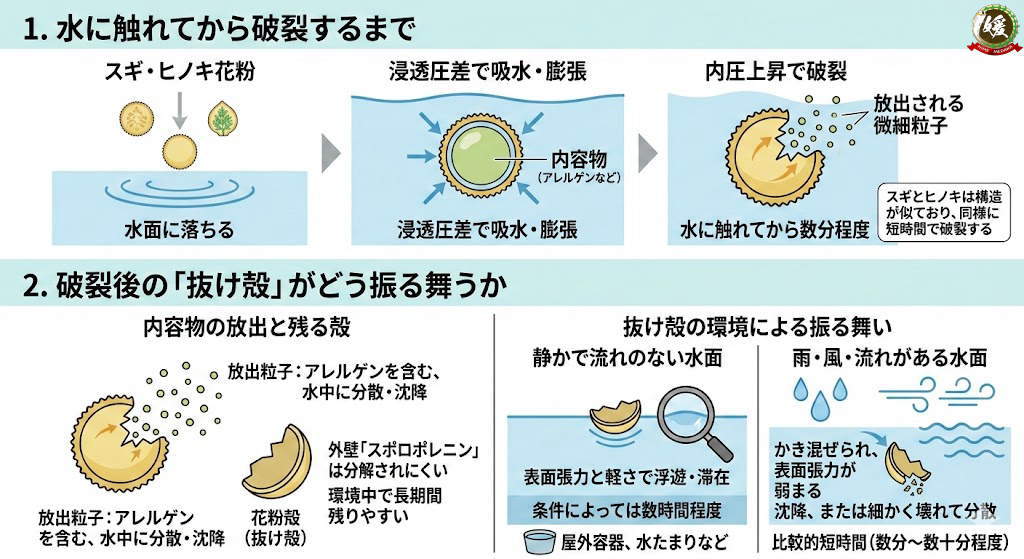 花粉が破裂すると、内部のアレルゲンを含む微細な粒子や内容物は周囲の水中に放出され、水中に分散したり、条件によっては沈降したりします。一方で、花粉の外側の殻(外壁)は「スポロポレニン」という非常に分解されにくい物質でできており、環境中で長期間残りやすいことが知られています。この殻は内容物が抜けた「空の抜け殻」になってもすぐには消失せず、水面付近や水中にとどまり続けます。静かでほとんど流れのない水面(屋外の容器や水たまりなど)では、花粉殻は表面張力や殻の軽さの影響を受け、条件によっては数時間程度、水面付近に浮遊・滞在し続けることがあります。逆に、雨や風、水流などで水面がかき混ぜられると表面張力の効果が弱まり、抜け殻は比較的短時間(数分〜数十分程度)で沈んだり、壊れてより細かく分散したりしやすくなります。