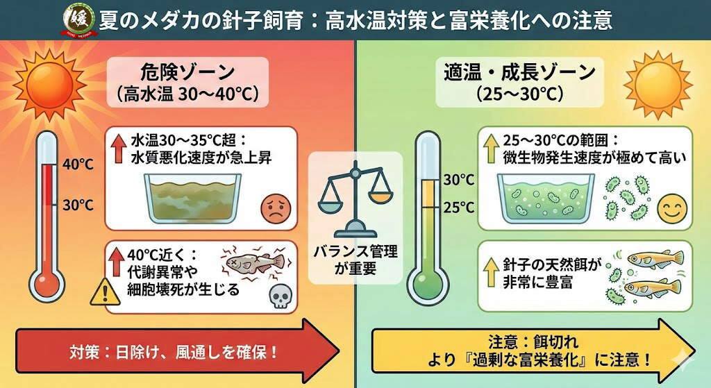 一方で、25〜30℃の範囲では微生物の発生速度が極めて高く、針子にとっての天然餌が非常に豊富な環境になります。したがって、餌切れよりも過剰な富栄養化に注意する必要があります。