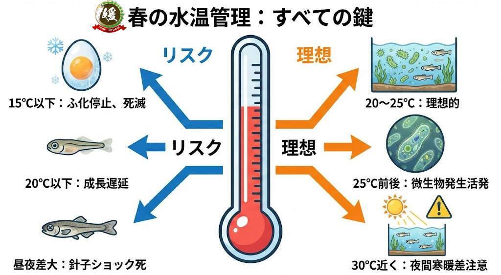 春先の理想的な水温は20〜25℃程度です。25℃前後では微生物の発生が活発になり、針子に必要な天然餌(インフゾリアやバクテリアプランクトン)が自然に湧きやすく、栄養供給の安定化につながります。日当たり次第で30℃近くにまで水温をあげることは可能ですが、夜間に冷え込むことによる寒暖差も考慮しましょう。