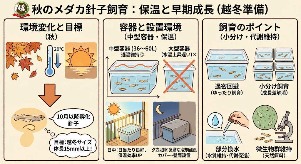 特に10月以降に孵化した針子は、越冬に耐えるだけの体力・サイズ(体長15mm以上)に早期成長させる必要があります。