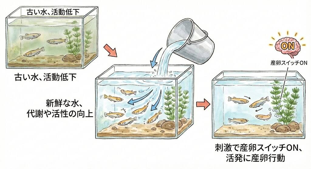 基本的には新水の刺激は産卵を誘発しますが、この時に加える新水が飼育水よりも冷たい場合は活性や代謝が落ちたり病気になるきっかけとなり逆効果になることがあります。