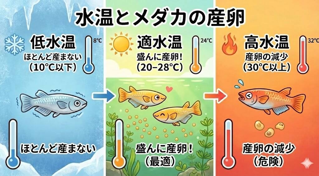 実は、メダカの産卵は「光・水温・栄養」という3つの条件がカギを握っています。逆に言えば、この条件さえ整えば、メダカは自然と卵を産むようになります。