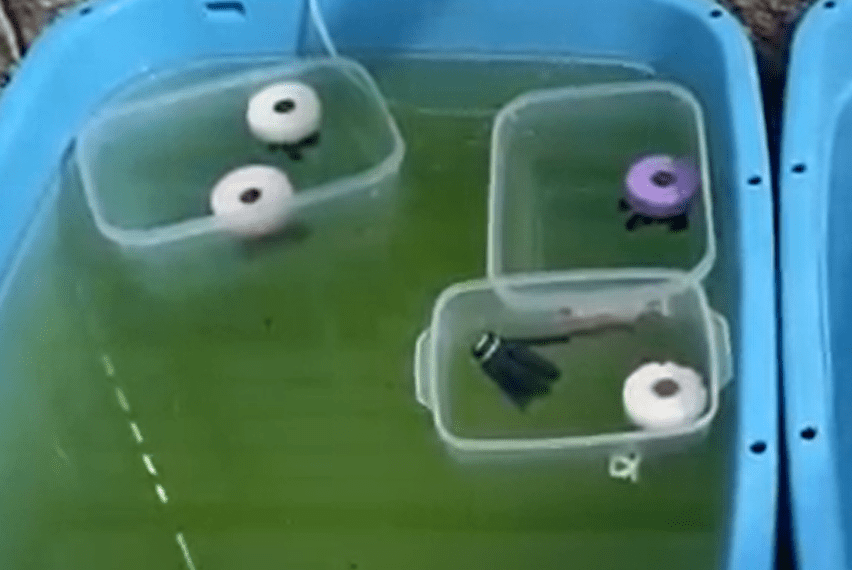 日が差す場所であれば人工飼料を与えていると、それらを養分として自然と微生物が湧いてきます。※水温の上がり過ぎに注意!
