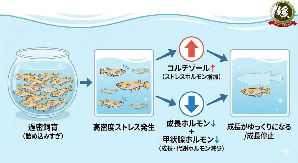 ※高密度ストレス → コルチゾール↑ → 成長ホルモン↓ + 甲状腺ホルモン↓ → 成長停止