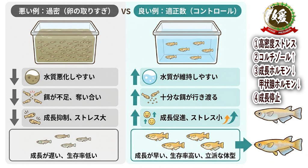 ここで少し専門的な補足をします。 「餌さえあげれば過密でも育つのでは?」と思われるかもしれませんが、実はそう単純ではありません。