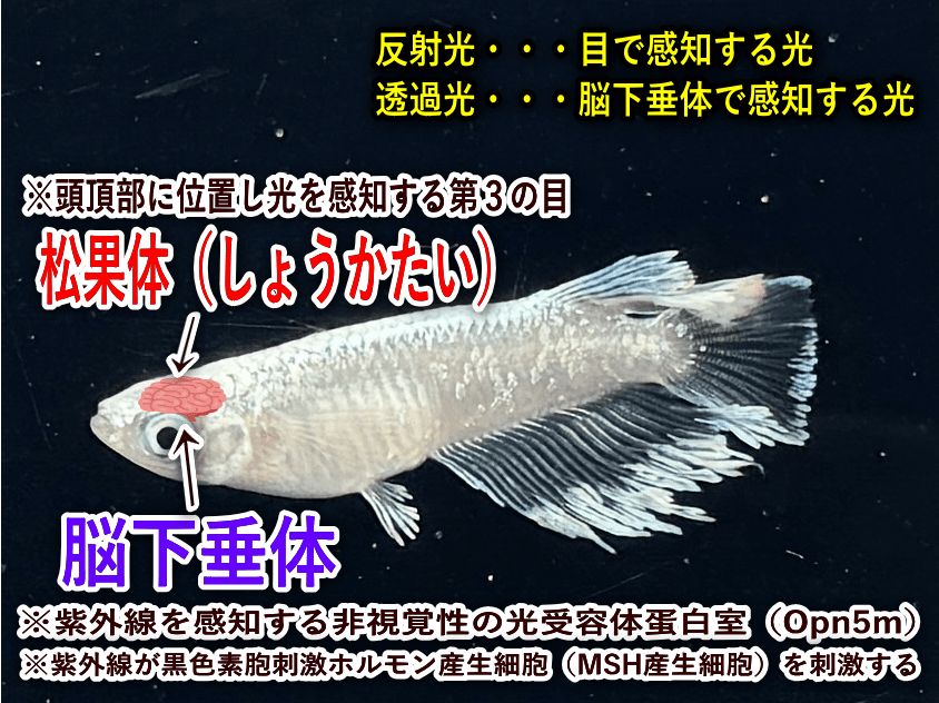 メダカの頭部には「脳下垂体」と呼ばれる内分泌器官があり、ここに紫外線(特にUV-A)を感知する特殊なたんぱく質「Opn5m(オプンファイブエム)」が存在しています。このたんぱく質が紫外線を直接受容すると、脳下垂体内の黒色素胞刺激ホルモン(MSH)が分泌されます。