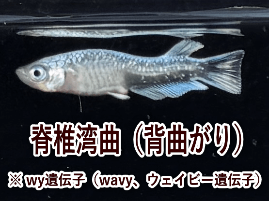 これらはメダカの脊椎湾曲に関する遺伝子(背曲がりの遺伝子)であるwy遺伝子(うぇいびーいでんし)によるものです。