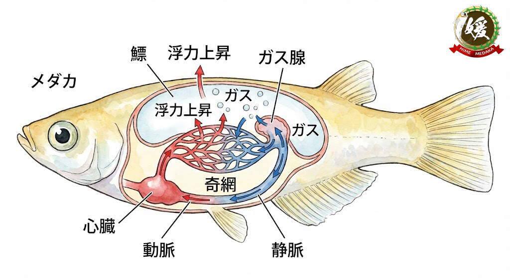 メダカは成魚では消化管と鰾がつながっていない無管鰾魚(physoclistous)とみなされ、鰾へのガスの出し入れは主にガス腺と奇網を介して行っている。