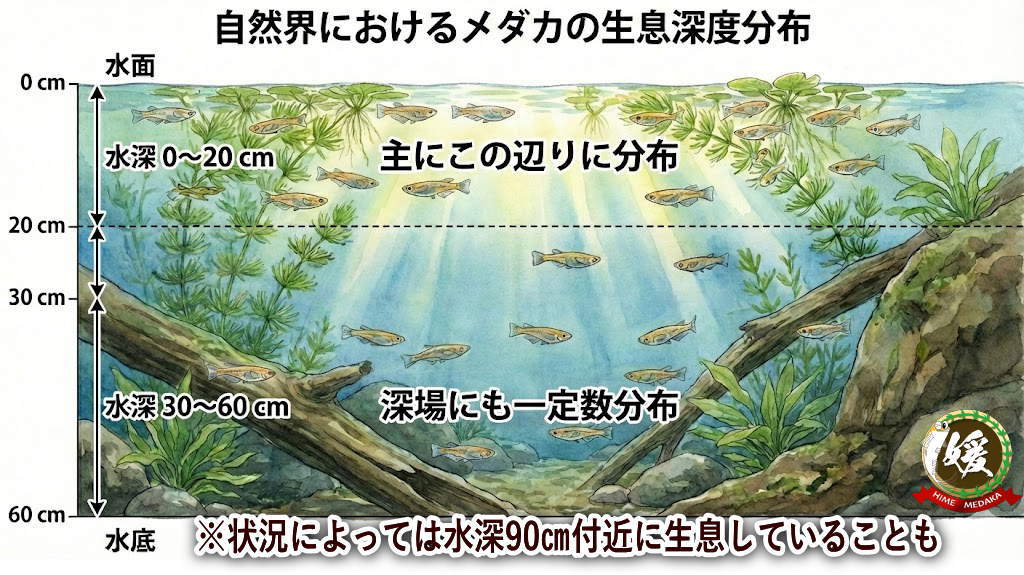 これは2025年に発表された最新の研究報告(bioRxiv: Fukamachi et al.)によるもので、これまでの「メダカ=表層魚」という常識を覆すデータとして注目されています。