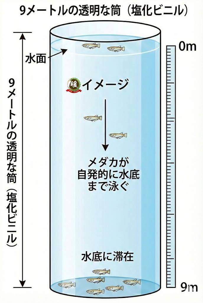 特殊な実験環境下において、メダカが「最大水深9メートル」まで自発的に潜り、滞在したというデータです。