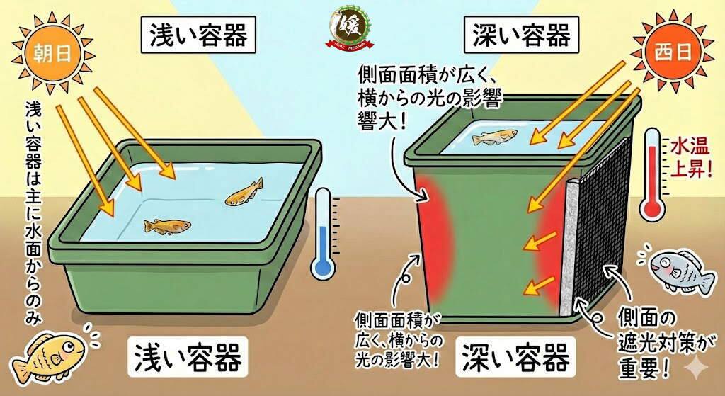 深い容器は側面の面積が広いため、横から直射日光が当たり続けると、容器の壁面そのものが熱を持ち、そこから熱が伝わって「お湯を沸かすような状態」になりやすくなります。これではせっかくの水量による恩恵(水温の安定)が台無しになってしまいます。