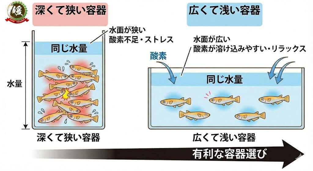もちろん、同じ水量であれば「表面積が広い(浅くて広い)」方が、酸素の溶け込み効率が良く、また個体間の一定の距離感によるストレスの緩和などがあるのは事実です。