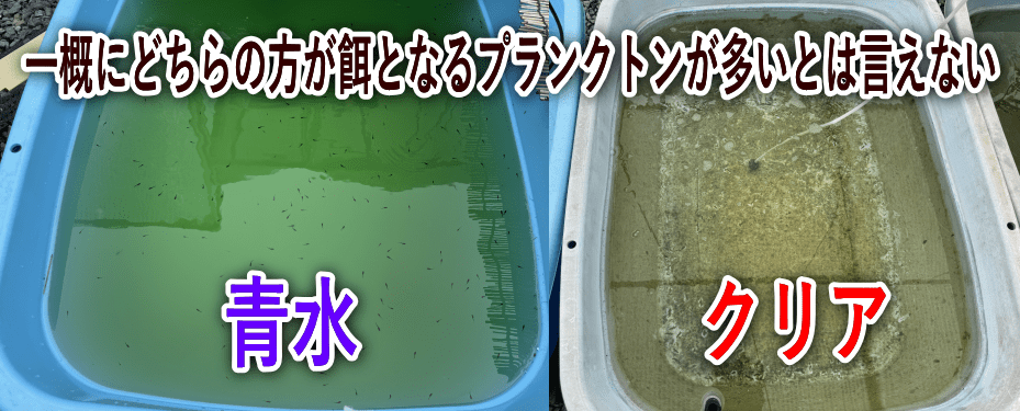 そのため、網の目を通り抜け、針子の口に入るほど細かな植物性プランクトンが豊富な青水を目指しましょう。