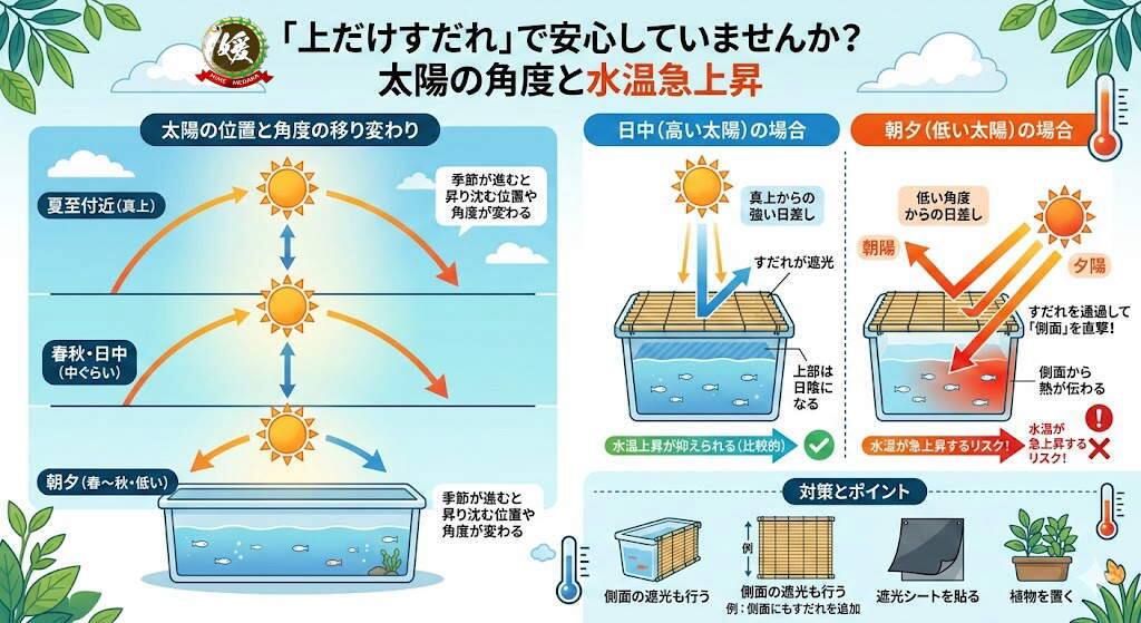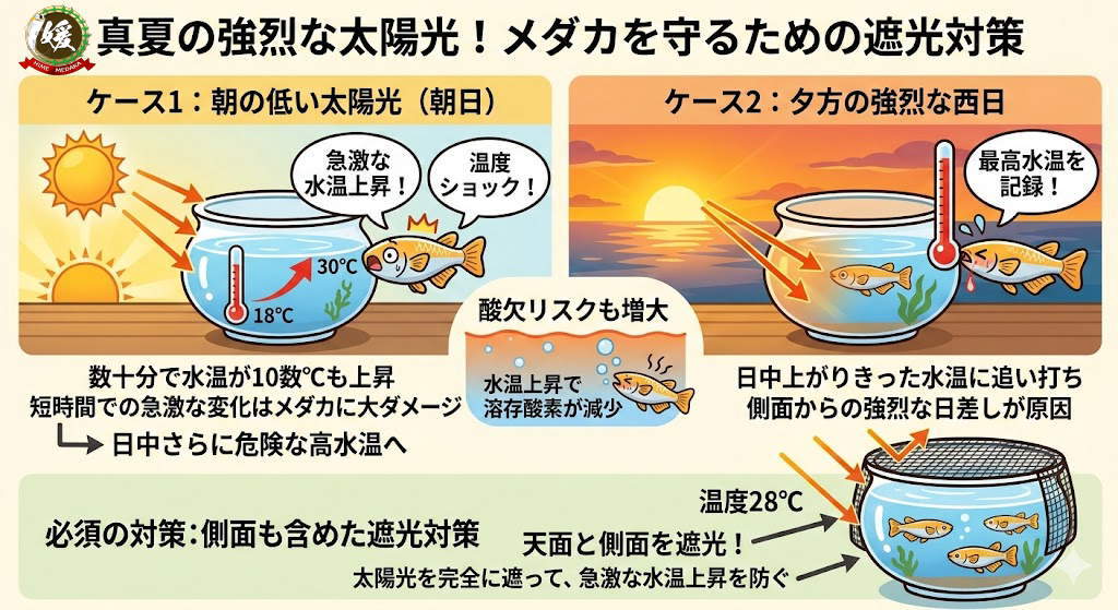 とくに強烈な「西日」や、早朝から差し込む「朝日」による側面からの熱は、僕たちが思っている以上にメダカの飼育水に大きな影響を与えます。