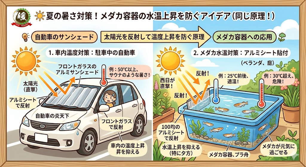 あの100均のアルミシート1枚で、車内の温度は劇的に変わります。メダカ容器の中の水温も同じ原理です。とくに西日が直撃する側の側面にアルミシートを貼ることで、かなりの水温上昇対策に繋がります。