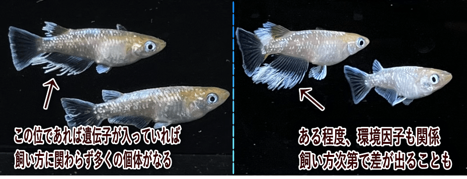 ロングフィンになる遺伝子、RLF(リアルロングフィン)になる遺伝子、松井鰭長の遺伝子、ヒカリ体形(Da)の遺伝子、遺伝子をその個体そのものが持っていなければ、鰭(ひれ)が変化することはありません。.jpeg)