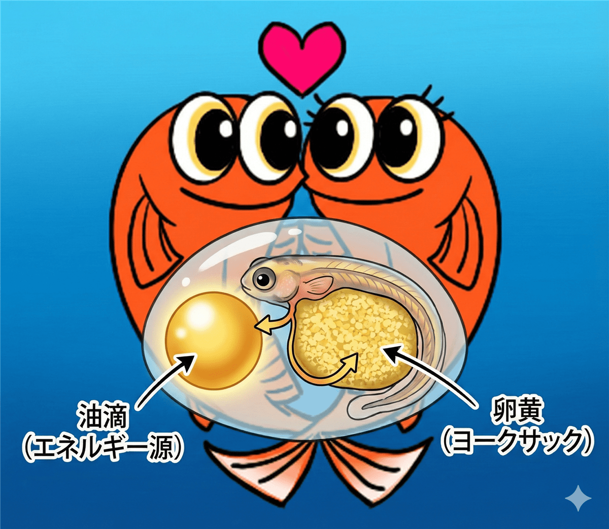 メダカの卵の中には「油滴(ゆてき)」と呼ばれる脂質の粒が入っています。これは孵化直後の稚魚が、自分で餌を食べられるようになるまでの唯一のエネルギー源(お弁当)です。