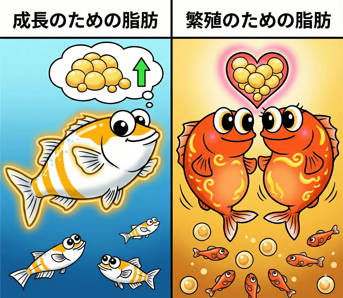 結果、「お弁当を持たずに生まれてきた稚魚」となり、餓死(生存率の低下)に繋がります。親の健康管理は、次世代の命に直結していきます。